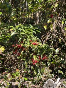 所々で目に入る万両の赤い実と葉の緑は